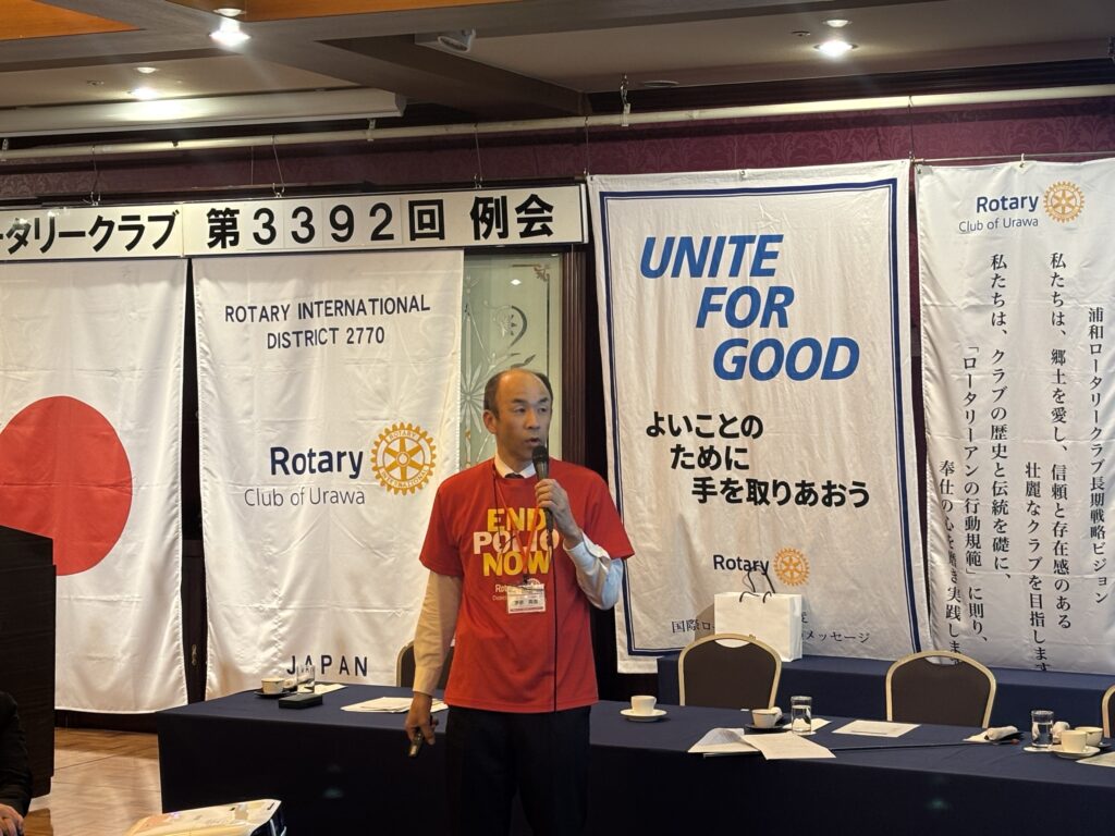 第3392回例会 2025年10月24日 最終更新日時 : 2025年10月24日 admin 10月24日金曜日、第3392回例会が開催されました。卓話の時間は「ポリオ・プラスについて」と題しまして、国際ロータリー第2770地区ポリオ・プラス委員の茅原真澄氏よりお話をいただきました。