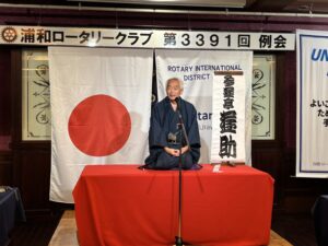 10月10日金曜日、第3391回例会が開催されました。卓話の時間には「米山梅吉落語」と題しまして三遊亭遊助様にお越しいただき落語を披露していただきました。